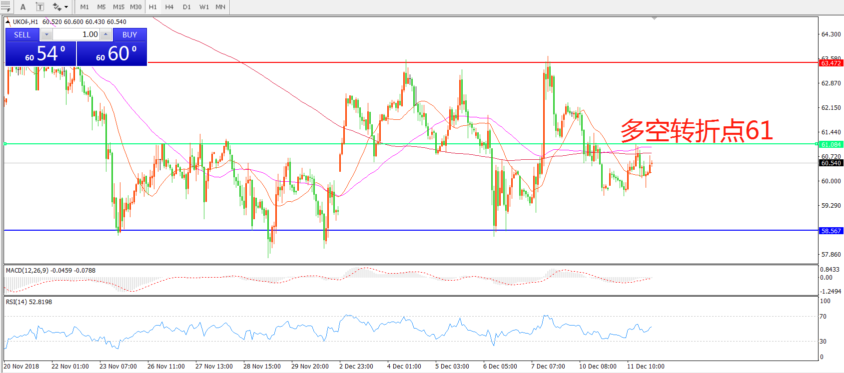 小时图看,油价冲高回落,最后收于均线系统之下,形态上呈现箱型震荡迹象,均线系统逐渐粘合,MACD绿柱缩短,红柱增加,重点关注多空转折点61美元一线得失