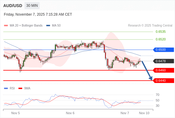在 0.6500 之下,看跌,目标价位为 0.6460 ,然后为 0.6440 。