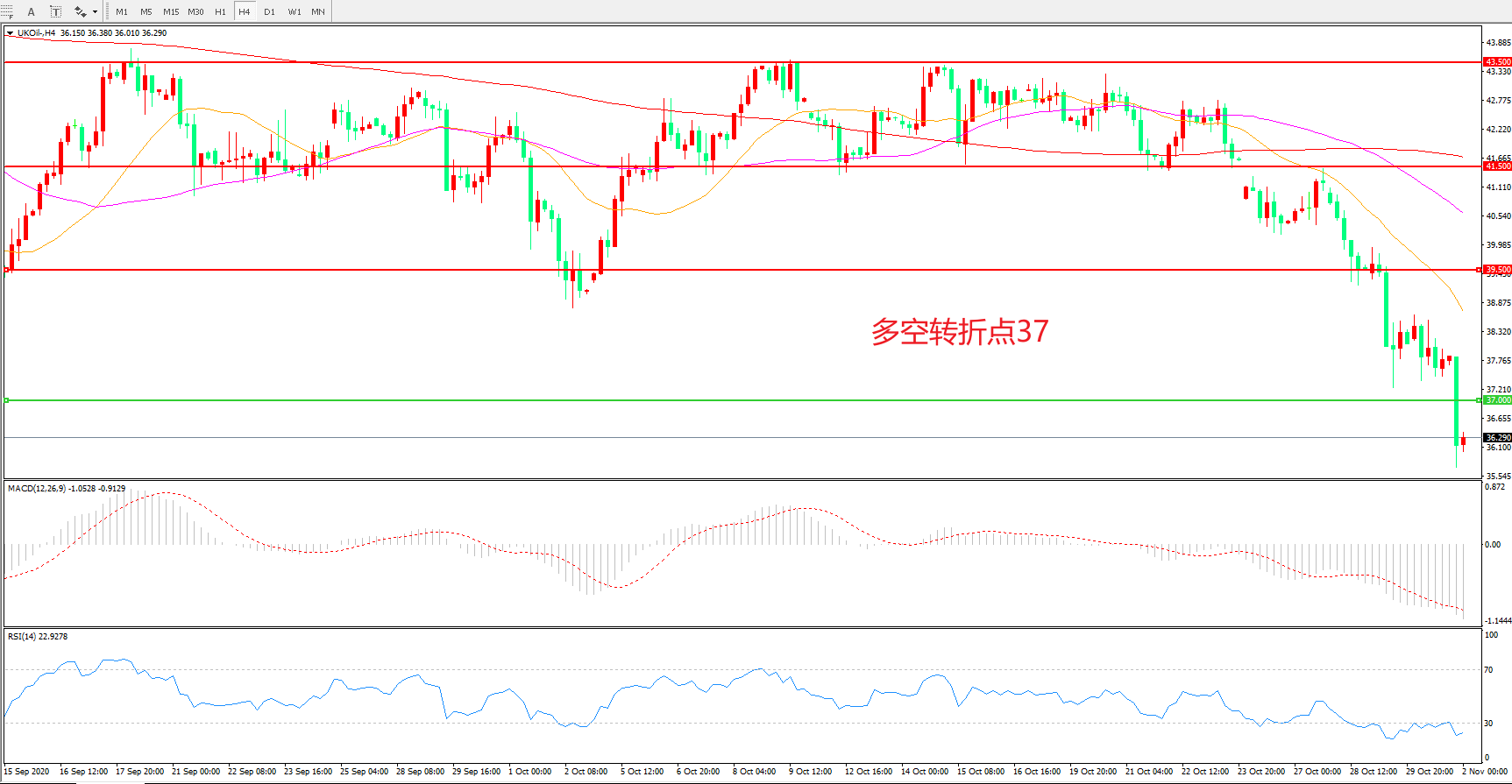 4小时图看,油价跳空低开,长阴下破,短期表现异常低迷,37美元成为多空分水岭,均线系统拐头向下,MACD绿柱增加,日内延续下行概率较大。