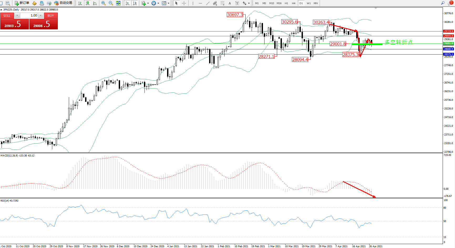 日经225指数4月27日(周二)收盘下跌122.73点,跌幅0.42%,报29003.50点。10年期日本国债收益率目标维持在大约0%不变,政策利率维持在-0.1%,预计短期和长期政策利率将维持在当前或更低水平;维持ETF购买额的12万亿日元上限,重申不限制购买日本国债的数量;如有必要,将毫不犹豫地采取更多宽松措施;日本经济可能呈趋势性改善,但复苏速度依然温和;2021财年GDP预测为4.0%,此前为3.9%,2022财年GDP预测为2.4%,此前为1.8%,2023财年GDP预测为1.3%;价格前景的下行风险更大,通胀预期持平,随着消费通胀转为正值,中长期通胀预期可能加剧;2021财年核心CPI为0.1%,此前为0.5%,预计2022财年核心CPI为0.8%,此前为0.7%,预计2023财年核心CPI为1.0%。