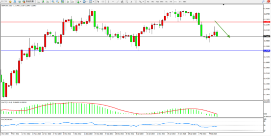 高位空头动力维持震荡下移,短期窄幅整理后有继续回撤迹象,市场看空情绪笼罩,市场有继续向下移动态势,上方压制关注1.22563附近,低位支撑关注1.18380附近,MACD指标处于0轴线下侧弱势整理,RSI指标处于50均衡线下侧弱势徘徊,如图: