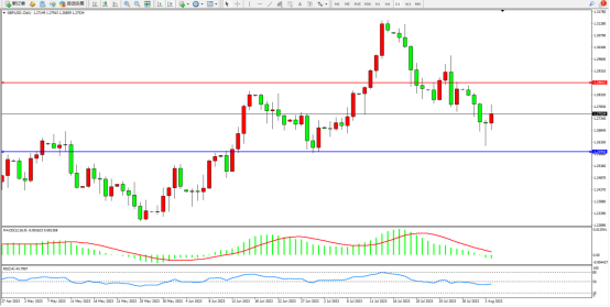 空头动力持续震荡下行,短期跌势或将延续,市场整体空头情绪笼罩,上方压制关注1.28815附近,低位支撑关注1.25950附近,MACD指标处于0轴线下侧弱势整理,RSI指标处于50均衡线下侧弱势徘徊,如图:
